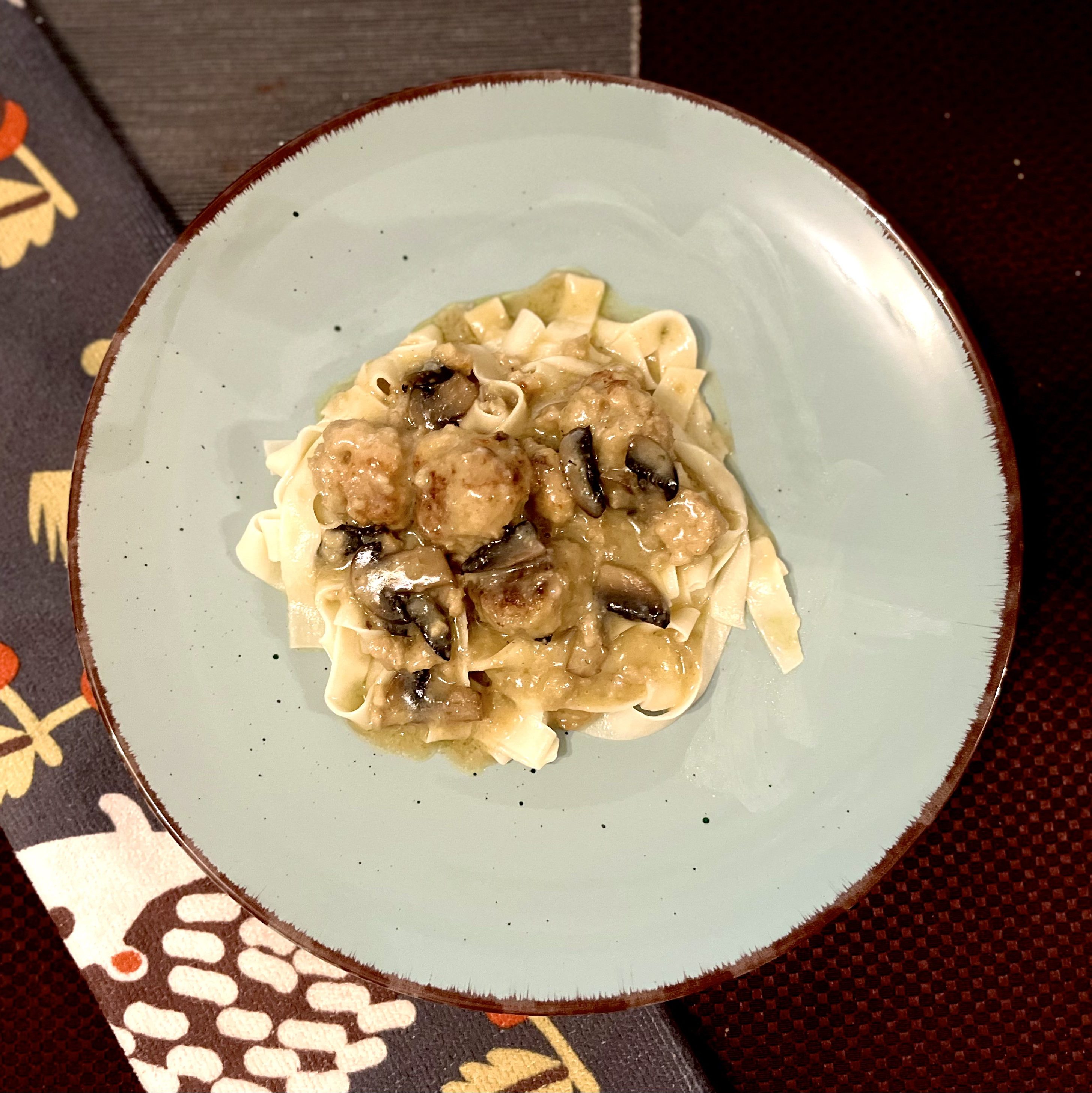Első nekifutásra svéd húsgolyóknak készültek, aztán kicsit módosult a végeredmény. Húgom kért ebédre valami “cuccos” dolgot, és a húsgolyók mellett döntöttem jó krémes szafttal. Azóta is nagy kedvenc itthon. Szerencsére könnyen kivitelezhető tejmentes formában is.