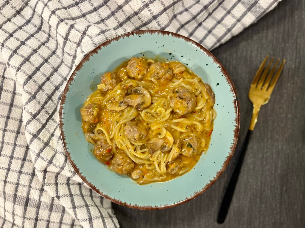 A húgom szereti menüre kérni az ilyen cuccos tésztákat és, hogy ne unja meg mindig keresem az új lehetőséget, amit bedobhatok neki. A korábbi krémes szaftos húsgolyókból kiindulva lett ez a verzió is. És ennél a tészta a szósszal egymagában is megállja a helyét és adott esetben nem kell hozzá húsgolyó. Mivel Párom inkább eszik húst hússal így én nem hagytam el a húst ez esetben.