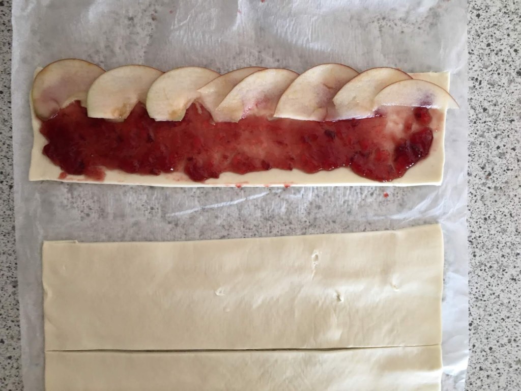 - A leveles tésztát felcsíkozzuk. Itt én 6 részre osztottam el a tésztát. Megkenjük nekünk tetsző mennyiségű lekvárral. Majd az egyik felére felsorakoztatjuk a már megpuhult almaszeleteket.