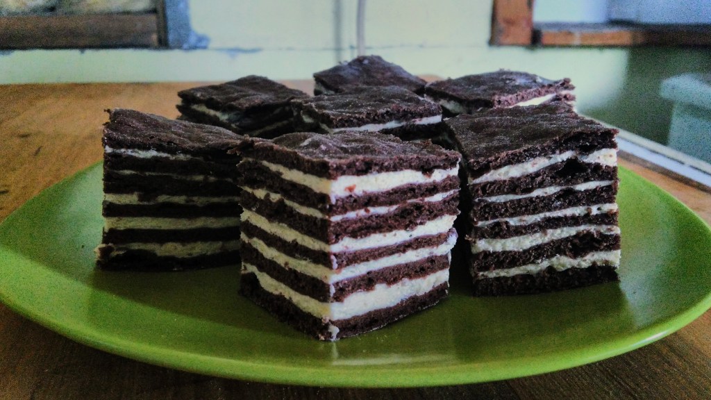 - A krémmel 5 rétegben megkenjük a lapokat. Szépen így: lap-krém-lap-krém…és az utolsó lapra vagyis a legtetejére már nem teszünk krémet.
